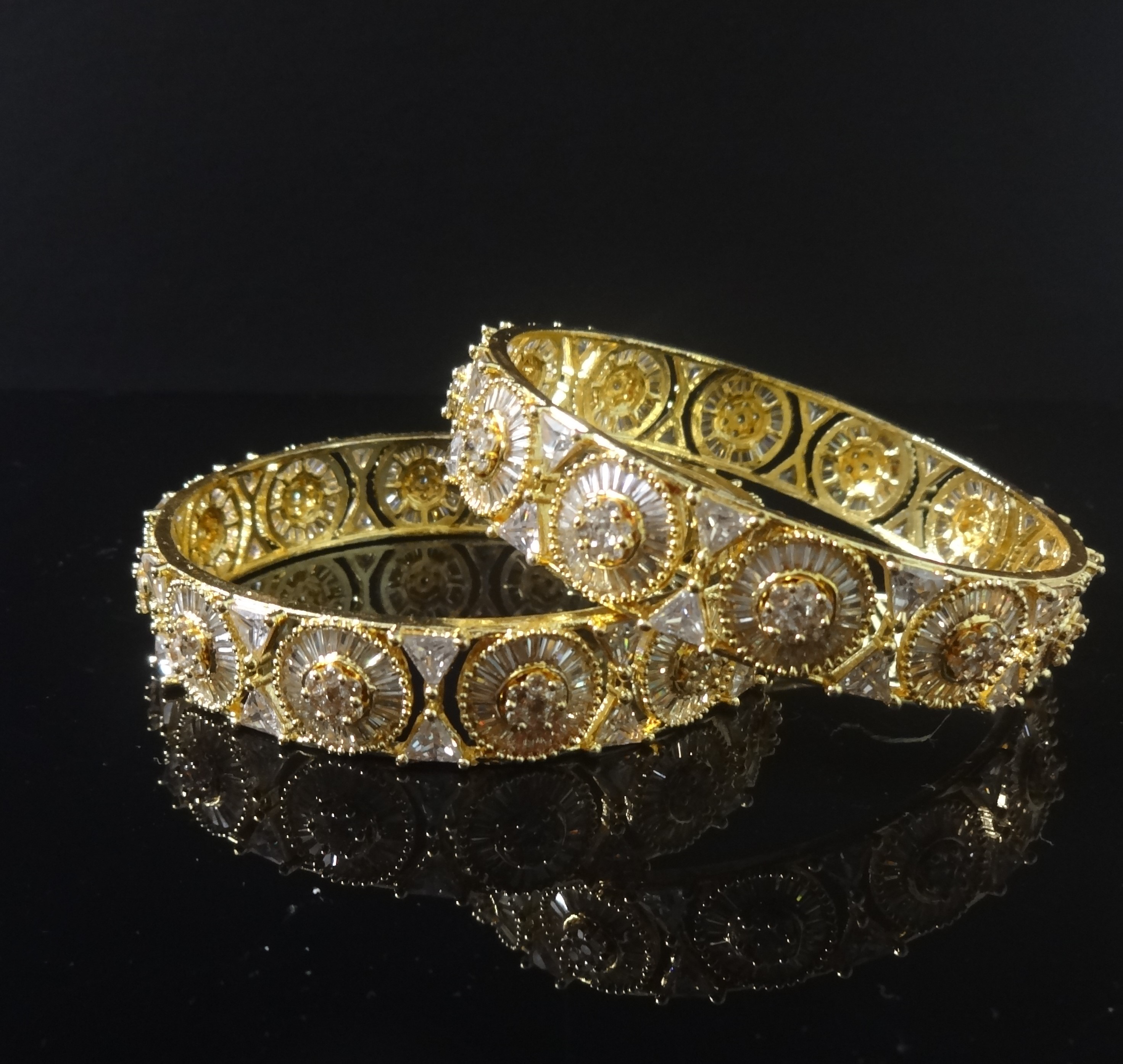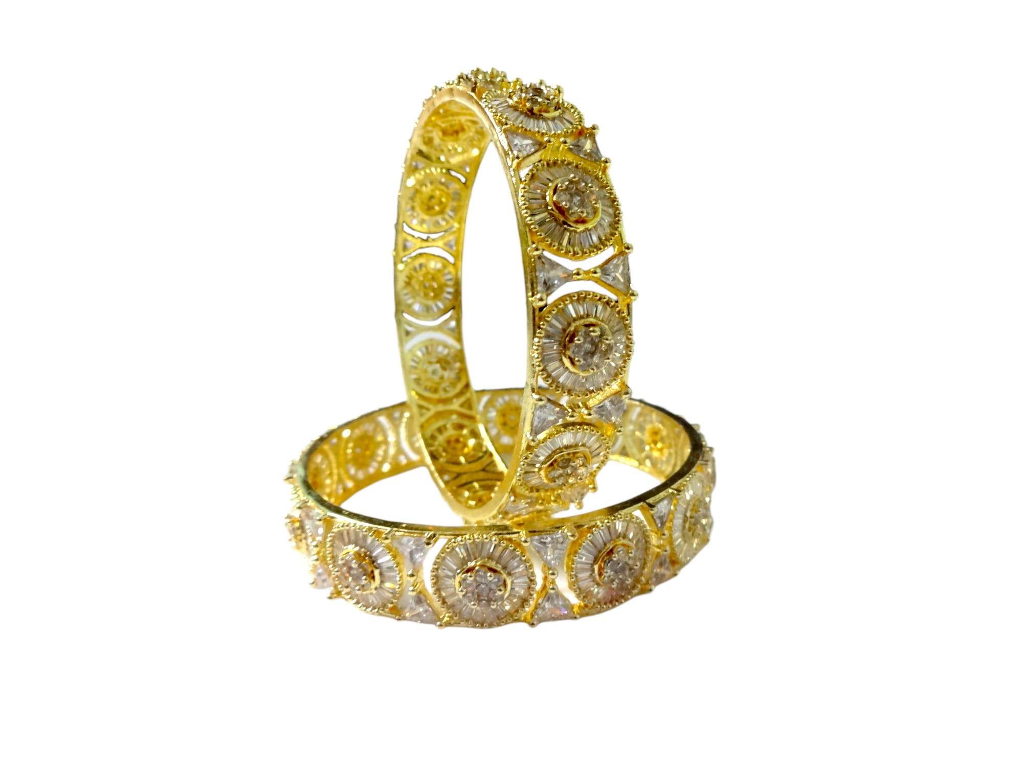 Indulge in the opulence of SHARLEEZ Set of 2 Rhodium-Plated Gold Color Floral Design AD Bangles and let your style shine brighter than ever. Embrace tradition with a modern twist and make a statement wherever you go.