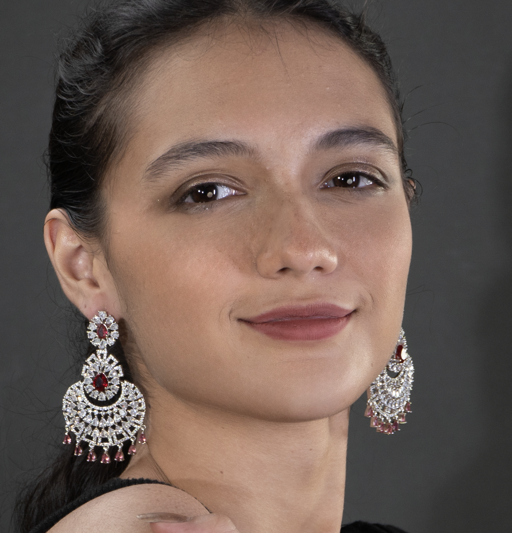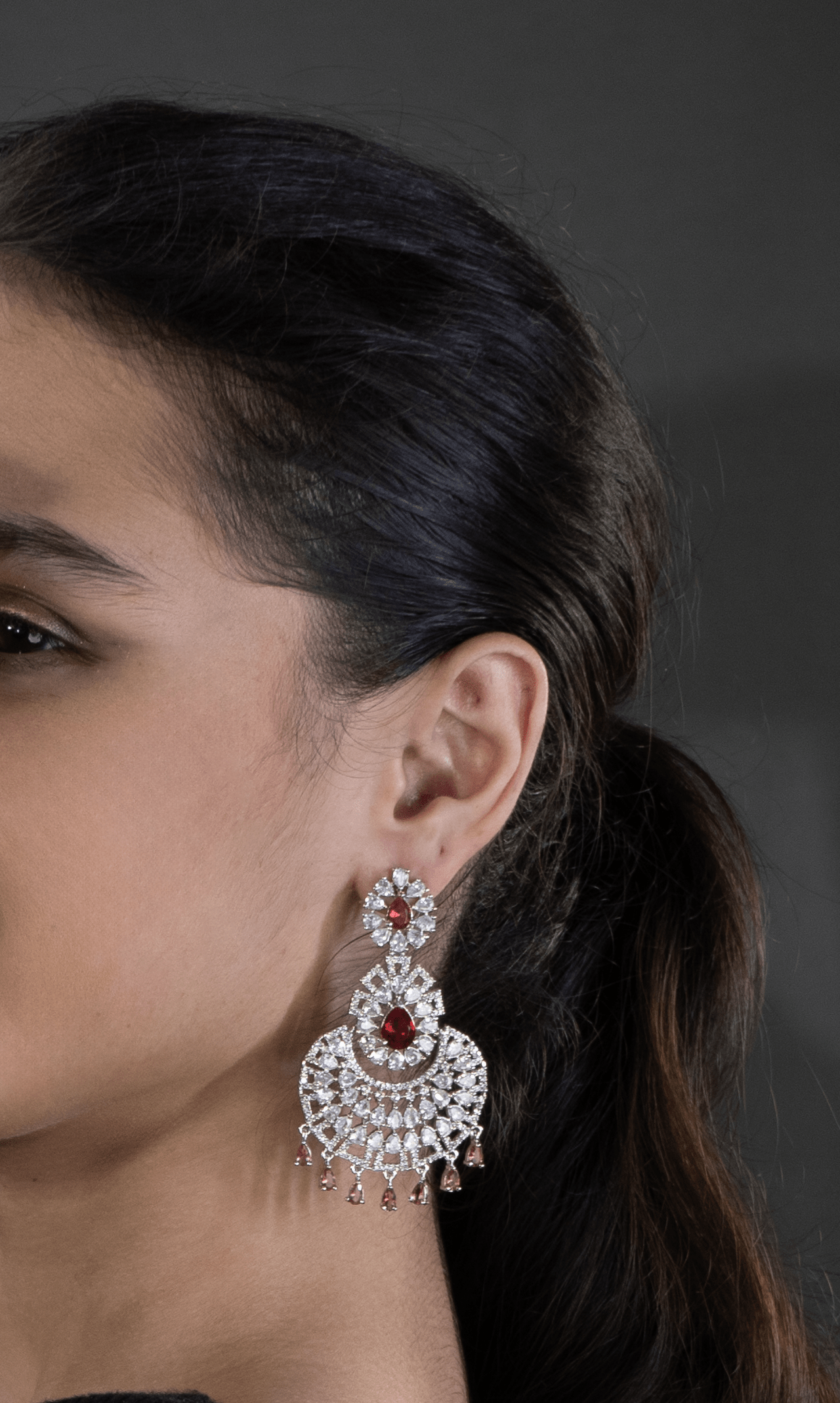 Elevate your look with our stunning Sharleez Silver Tone Chandbali Earrings. Crafted with intricate detail, these earrings feature radiant red teardrop-shaped stones set amidst shimmering AD stones, all elegantly framed in silver-tone brass. Their size and design make them a standout accessory for any occasion, adding a touch of glamour and sophistication to your ensemble.