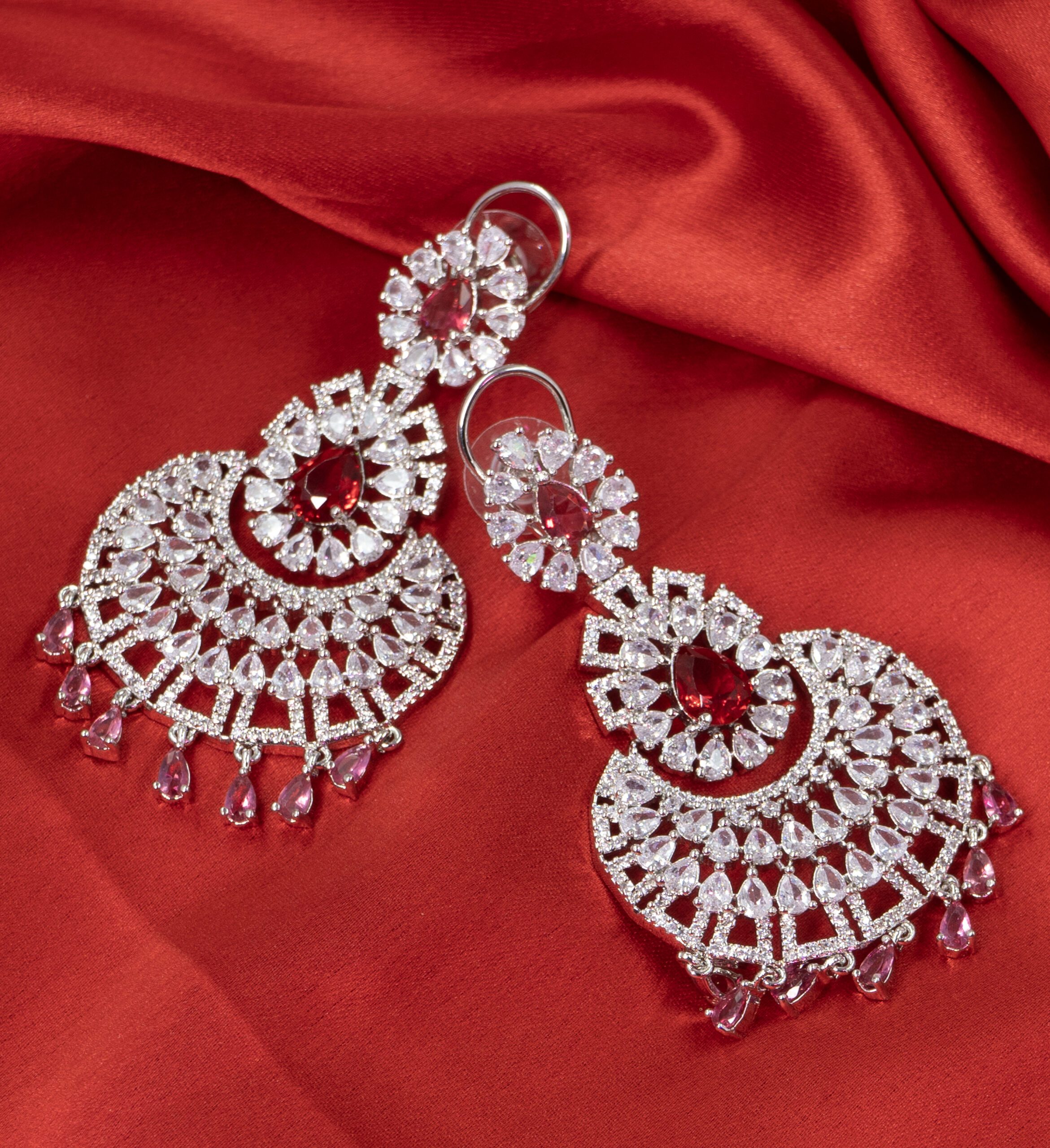 Sharleez Silver Tone Chandbali Earrings with Red Teardrop Stones